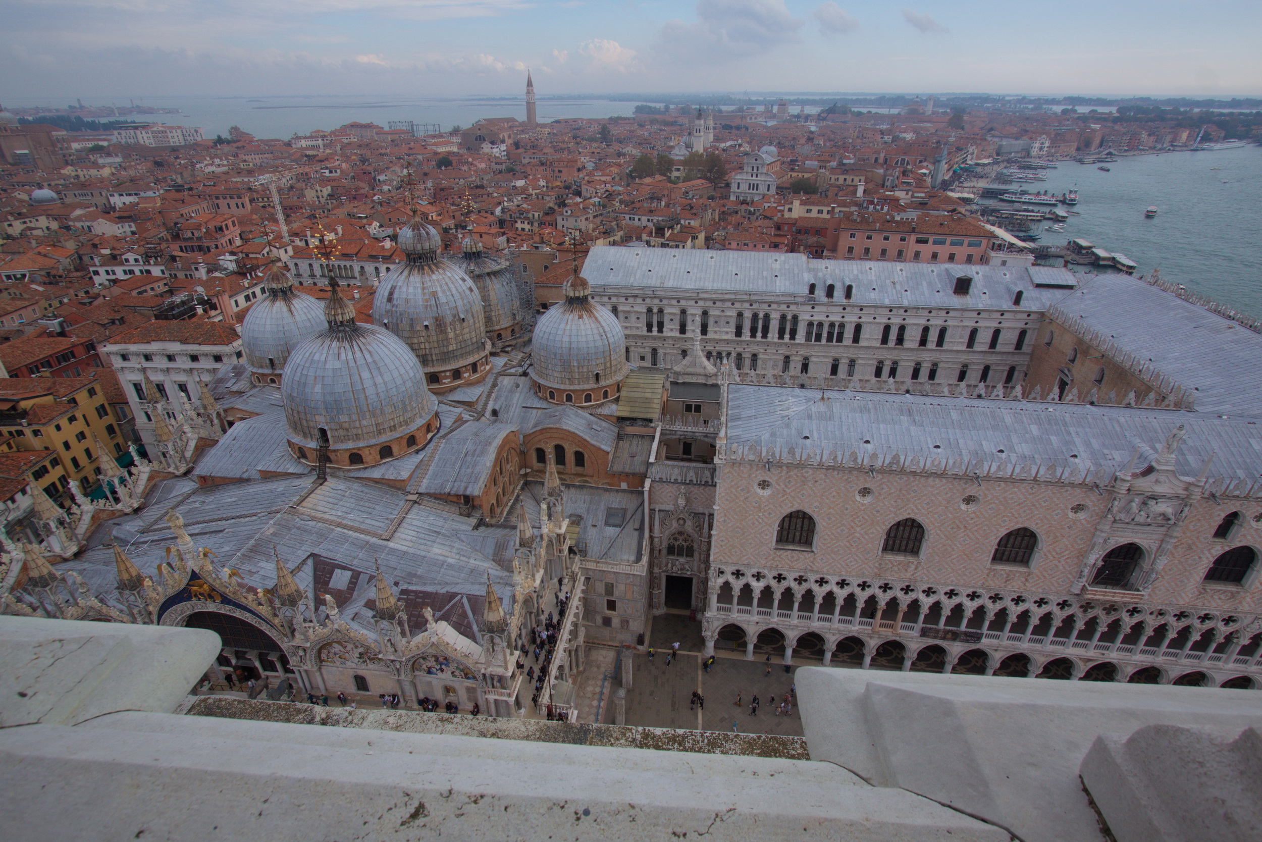 Wir waren bereits zum vierten Mal hier und endlich wollten wir mal die Campanile am Markusplatz besteigen. Die Beine konnte man gar nicht beanspruchen, weil der Zutritt nur mit dem Aufzug möglich war. Die Schlange war kürzer als erwartet und so genossen wir bald die wunderschönen Aussichten auf die Stadt. Das Einzige was uns fehlte war die Sonne. Wir haben eine halbe Stunde oben auf sie gewartet. Wann ist sie gekommen? Natürlich kurz nachdem wir aufgegeben haben und wieder unten waren.