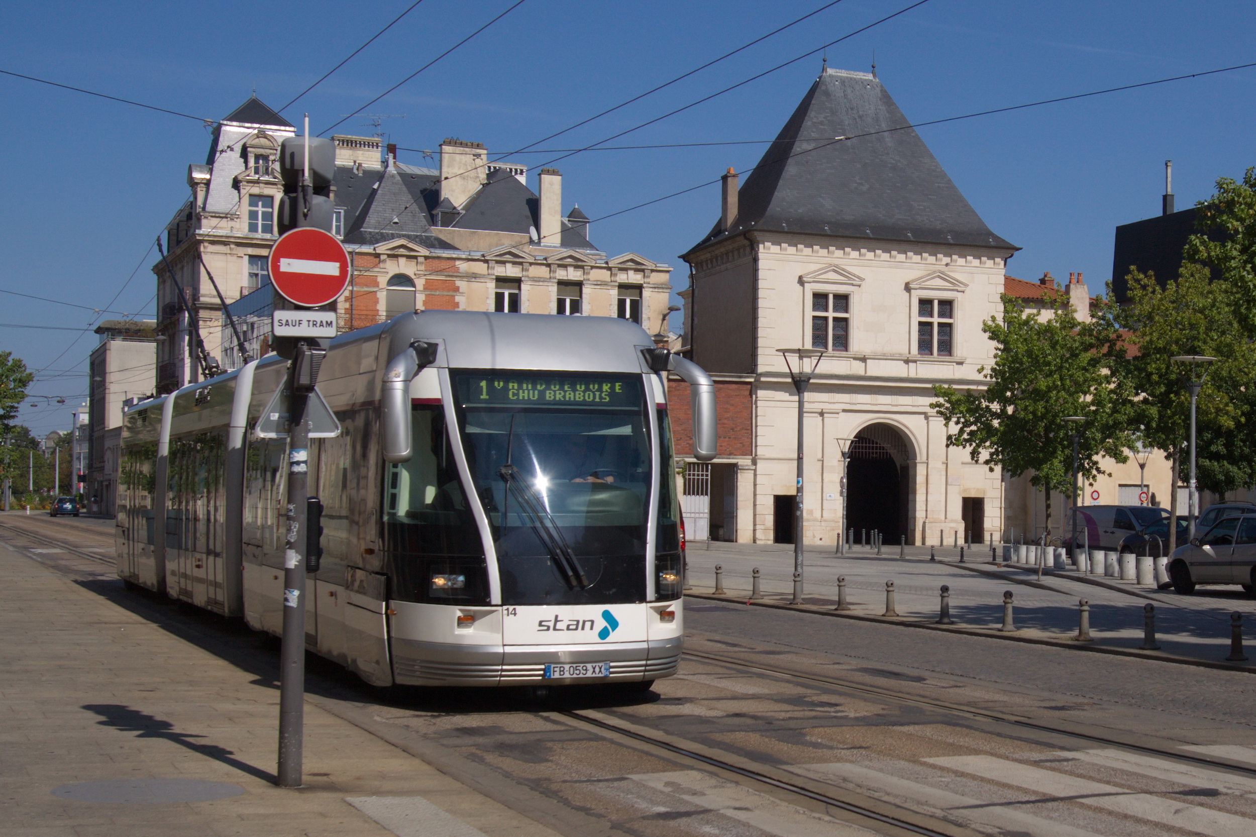 Es gibt eine interessante Straßenbahn in Nancy. Sie hat zwei Stromabnehmer wie ein Trolleybus, nur ein Gleis in der Mitte und Gummiräder.